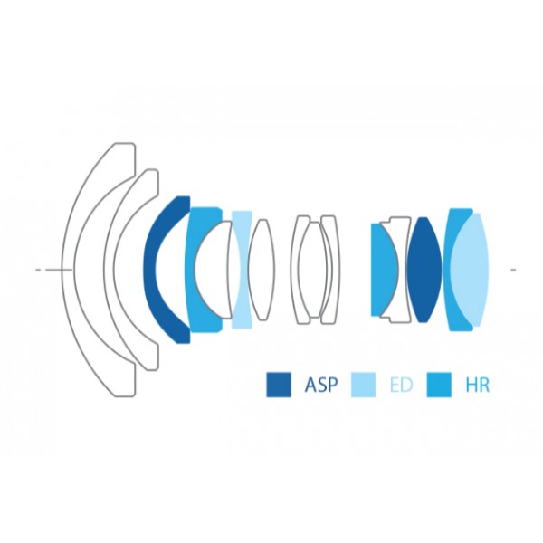 Son excellente qualité optique est dûe à la construction de l’objectif comprennant, entre autres, 3 éléments HR, 2 éléments ED et 2 éléments asphériques, garantissant une très faible distorsion de 2%.
