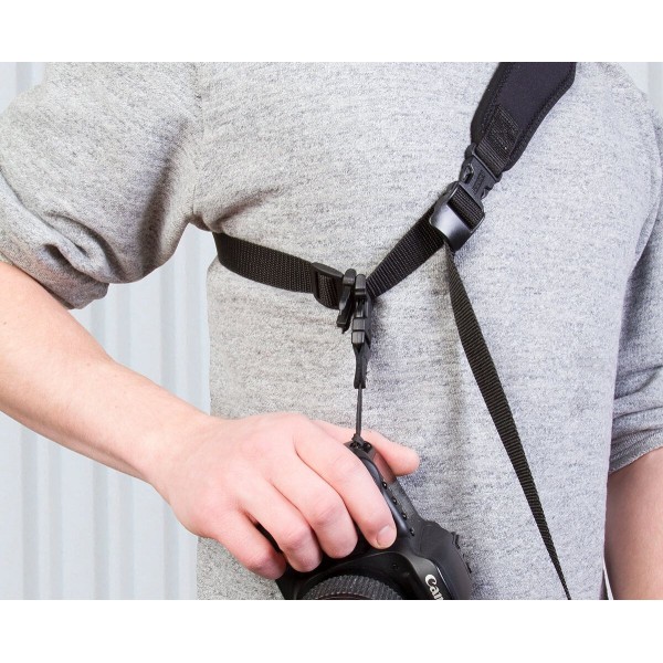 La courroie offre un accès rapide à votre appareil photo ou jumelles. Votre équipement se bloque en toute sécurité à vos côtés et vous pourrez faire glisser votre équipement rapidement pour réaliser des prises de vues.