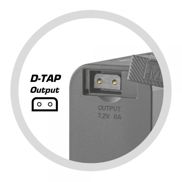 Elle est équipée d'une sortie D-Tap (7.2V / 6A) qui donne la possibilité d'alimenter des accessoires vidéo comme par exemple un moniteur vidéo externe.
