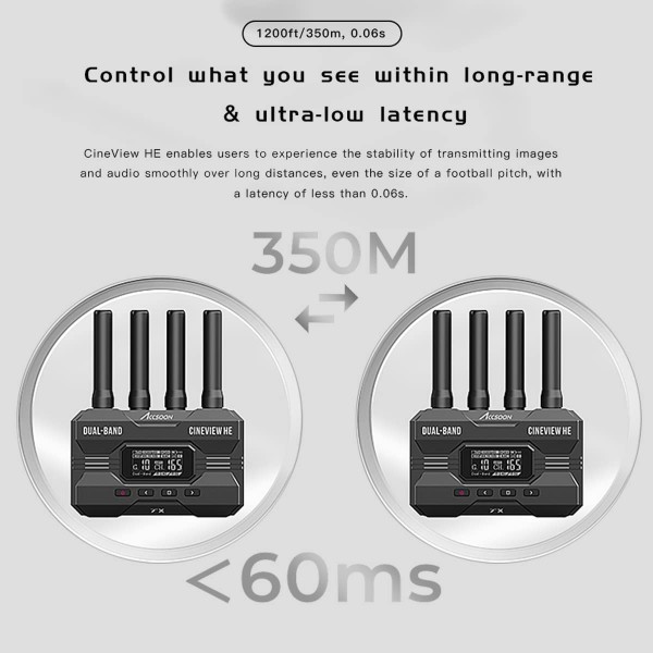Accsoon CineView HE est un kit émetteur et récepteur sans fil double bande HDMI doté d'un nouveau port USB-C sur le récepteur pour la diffusion directe en direct (UVC).