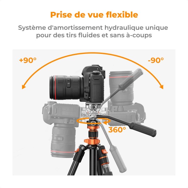 Le trépied est équipé d'une tête hydraulique avec réglage en douceur, ce qui permet de réaliser des prises de vue aériennes et panoramiques pour répondre aux besoins des photographes dans différents scénarios de prise de vue.