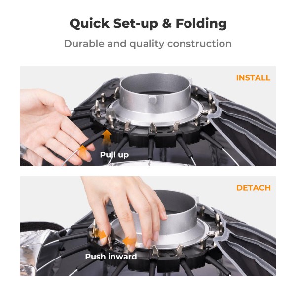Avec une structure monobloc, la softbox peut être rapidement ouverte et fermée en quelques secondes.