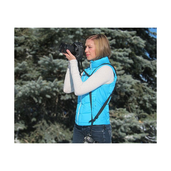 Les 2 appareils peuvent glisser librement de haut en bas le long de la sangle sans s’entrechoquer. Le coussin de sangle en néoprène breveté incorporé offre un soutien et un confort maximal. La surface antidérapante maintient solidement sur l’épaule. Si une seule caméra est nécessaire, les raccords rapides vous permettent de supprimer l'une des attaches rapidement et facilement.