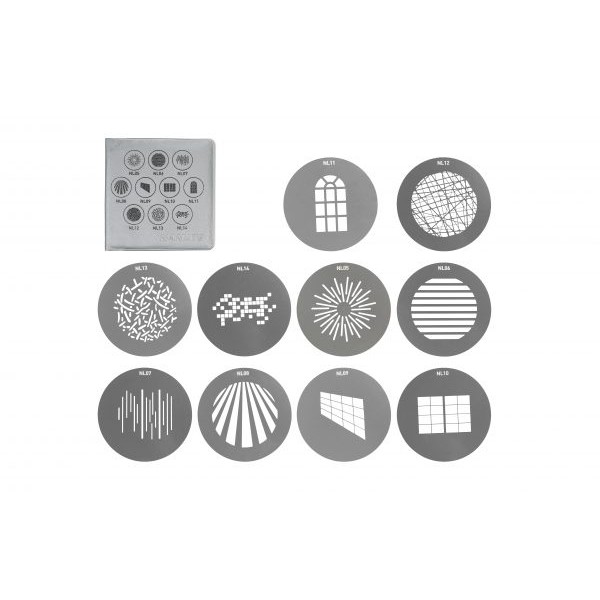 Le Nanlite Gobo Set 1 se compose de 10 gobos destinés au nez optique Nanlite Forza 60 Projection Attachement (19/36°).